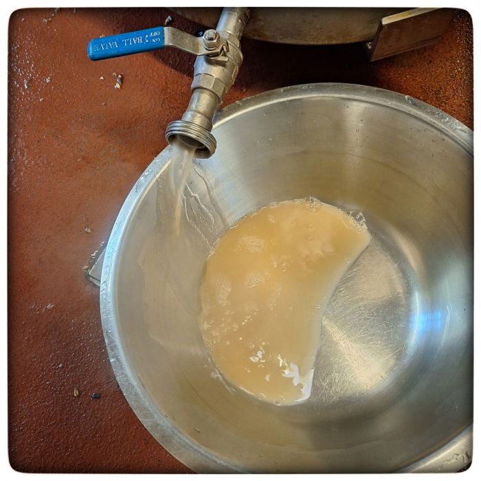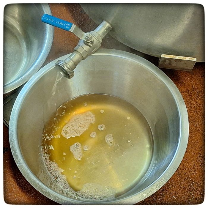 Dabei kommt zunächst recht trübe Brühe, die so lange und immer wieder durch den Treberkuchen(*) gefiltert wird, bis sie klar läuft.