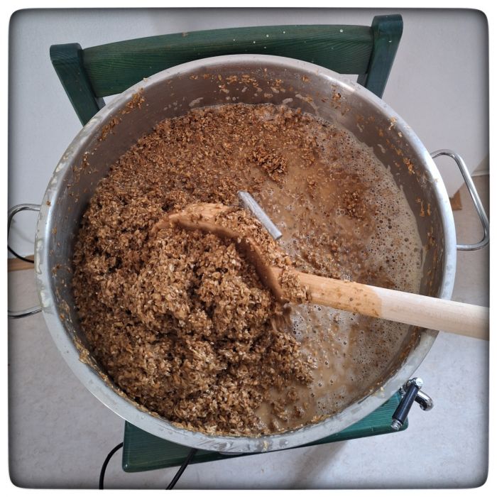 Heute soll es ein Winterbock werden. Ob da alles Malz in den Kessel passt? Es passt. Umrühren geht schwer, weil es schon eine recht dicke Pampe ist. Da dauert auch das Aufheizen. Alles recht zäh.