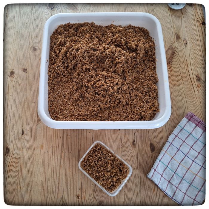 Auch wenn sich "Treberkuchen" nach Sonntag Nachmittag und Kaffeeklatsch anhört, ist das tatsächlich ein leidiges Thema unter Hobbybrauern. Denn wohin damit? Wir wollen noch einmal einen Anlauf machen und Treber in einen Brotteig unter mischen. Das löst das Problem mit dem Treber jedoch keineswegs. Warum? Nun, seht euch das Foto an. Beim Winterbock sind etwa zwei solche Wannen voll Treber angefallen. Und die kleine Portion unten wird wohl für drei Laib Brot reichen. Da bleibt noch einiges für die Biotonne.