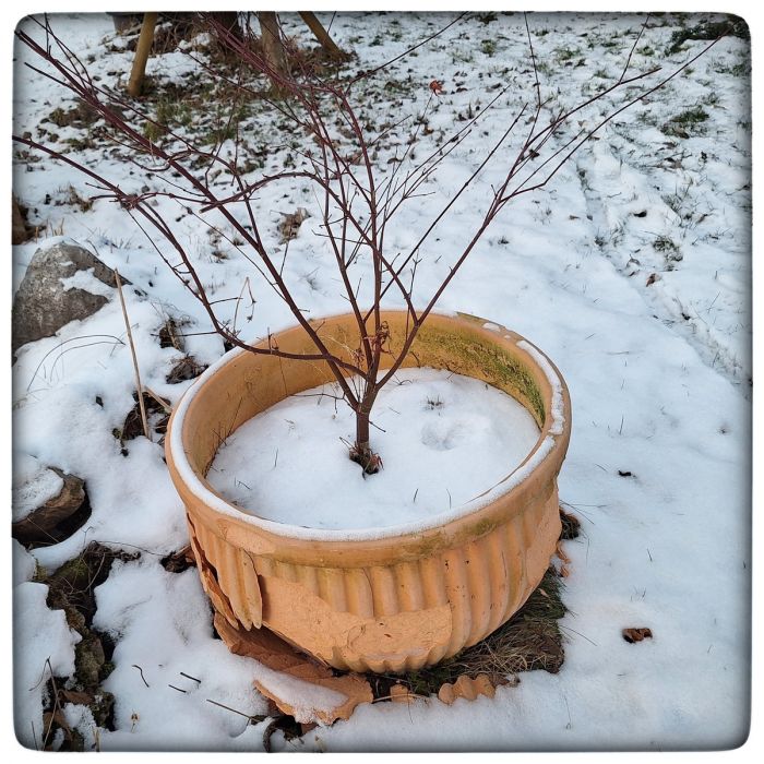 Haben wir uns eine sündteure Schale für den zierlichen Ahorn gekauft... hätten wir uns sparen können. Die fällt rasant auseinander. Die wird den Winter nicht überstehen.