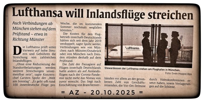 Es ist ja nicht alles schlecht, was dieser Tage passiert. Wenn die Lufthansa zum Beispiel meldet, dass sie ganz viele Inlandsflüge streicht, dann ist das eine gute Meldung.
